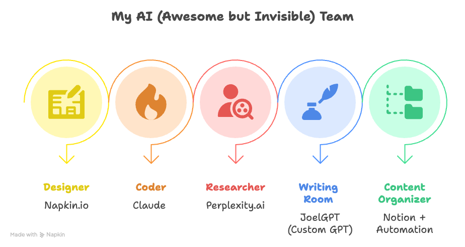 That foundation evolved into something more intentional. Today, I lead what I call my Awesome but Invisible team ;), a collection of AI-powered products that expand my capacity without hiring anyone new.