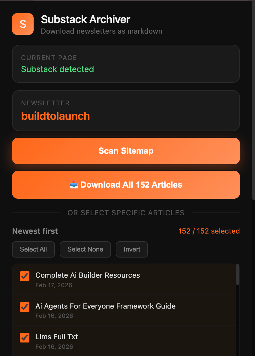I subscribe to [list your platforms, e.g., Substack newsletters, Medium publications, etc.] and I’m constantly reading great content that I forget exists a week later. I want to build a tool that pulls my subscribed content and saves it locally. Let’s start with one platform: [pick one]. Help me build a Chrome extension (or local script) that can extract the articles I have access to and save them to my system. We’ll figure out storage after. First I just want to capture the content reliably.