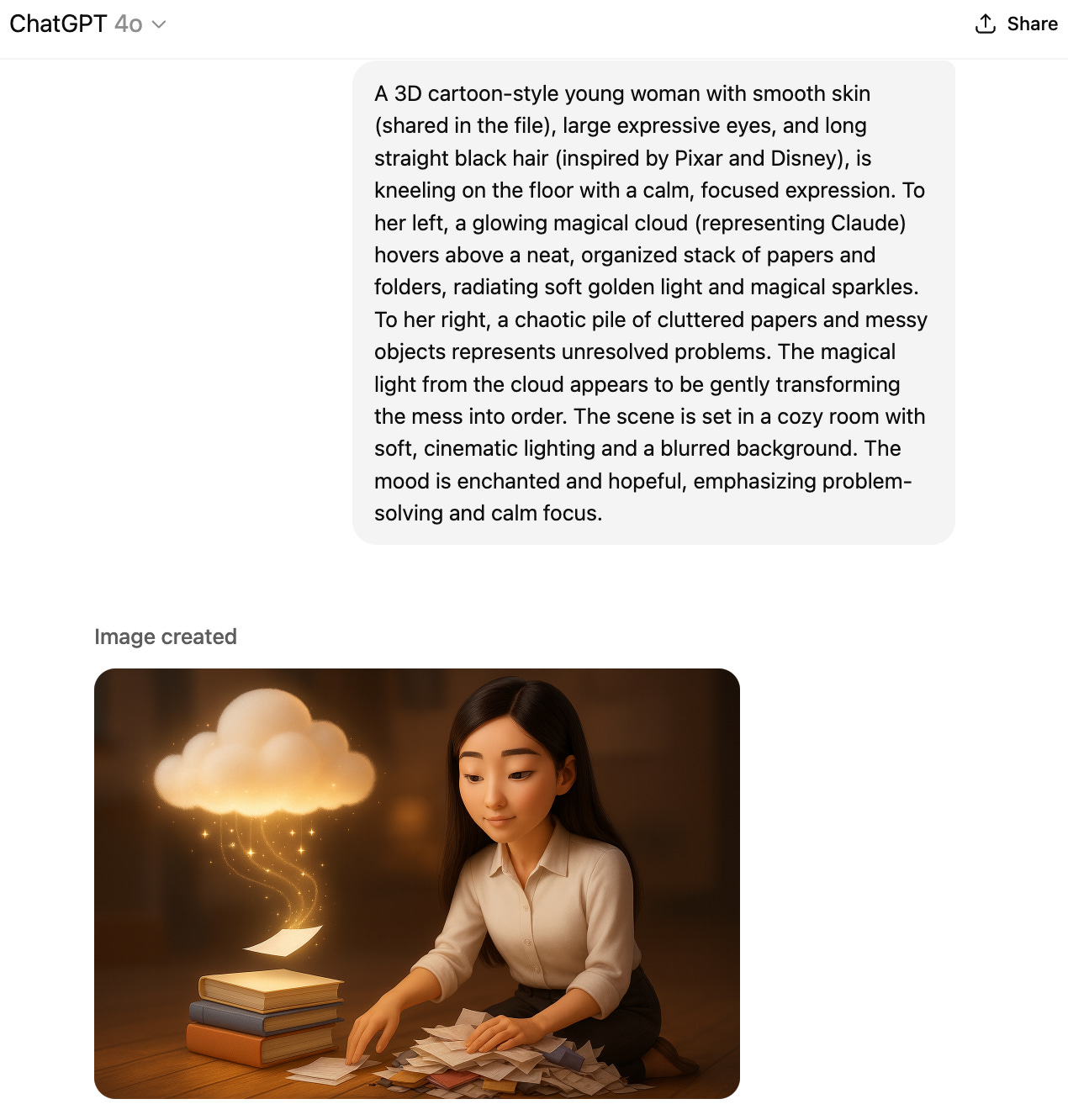 Step 4: ChatGPT generates a detailed, thorough prompt that incorporates my style preferences, the reference character, and the scenario I described.