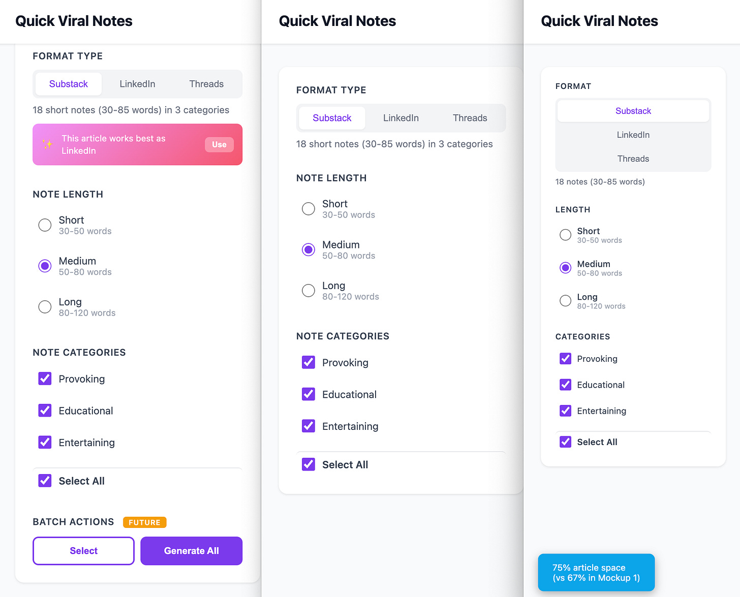 I was redesigning the dashboard for Quick Viral Notes. The existing layout worked, but I wanted to test different sidebar configurations. Should the controls be 1/3 of the screen or 1/4? Should future features like saved presets and AI suggestions live in the sidebar or separate sections?