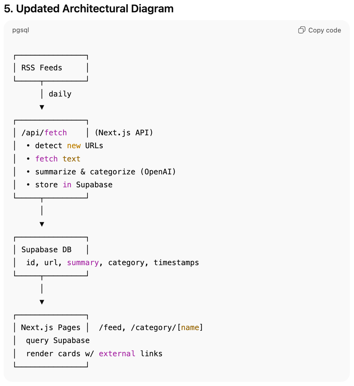 ChatGPT proposed: Next.js frontend with Supabase for database and cron scheduling. Text diagram: RSS URLs → `/api/fetch` (Next.js route) → rss-parser + trafilatura → save to Supabase → summarize via OpenAI → store summaries back → display on `/feed` page.