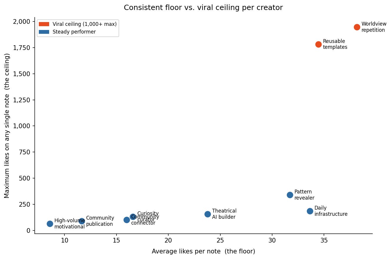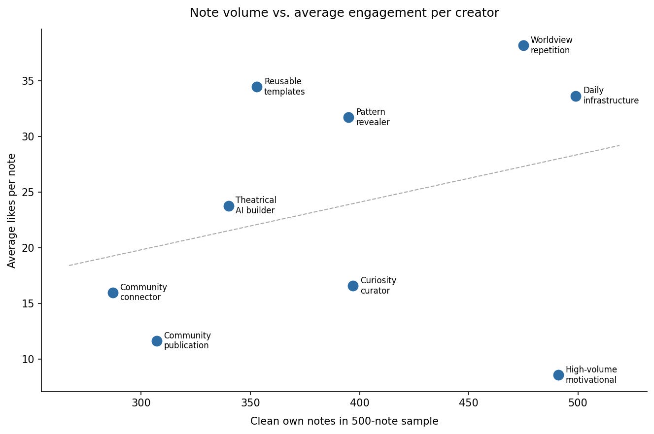 One of the more revealing patterns: the creator with the lowest per-note average has a clear split in their own data. Their highest-performing note (”Your business should serve your life. Not consume it.”) has nothing to do with AI. Their purely motivational notes consistently outperform their AI content. The data is telling you what the audience actually followed them for. The feed just hasn’t caught up yet.