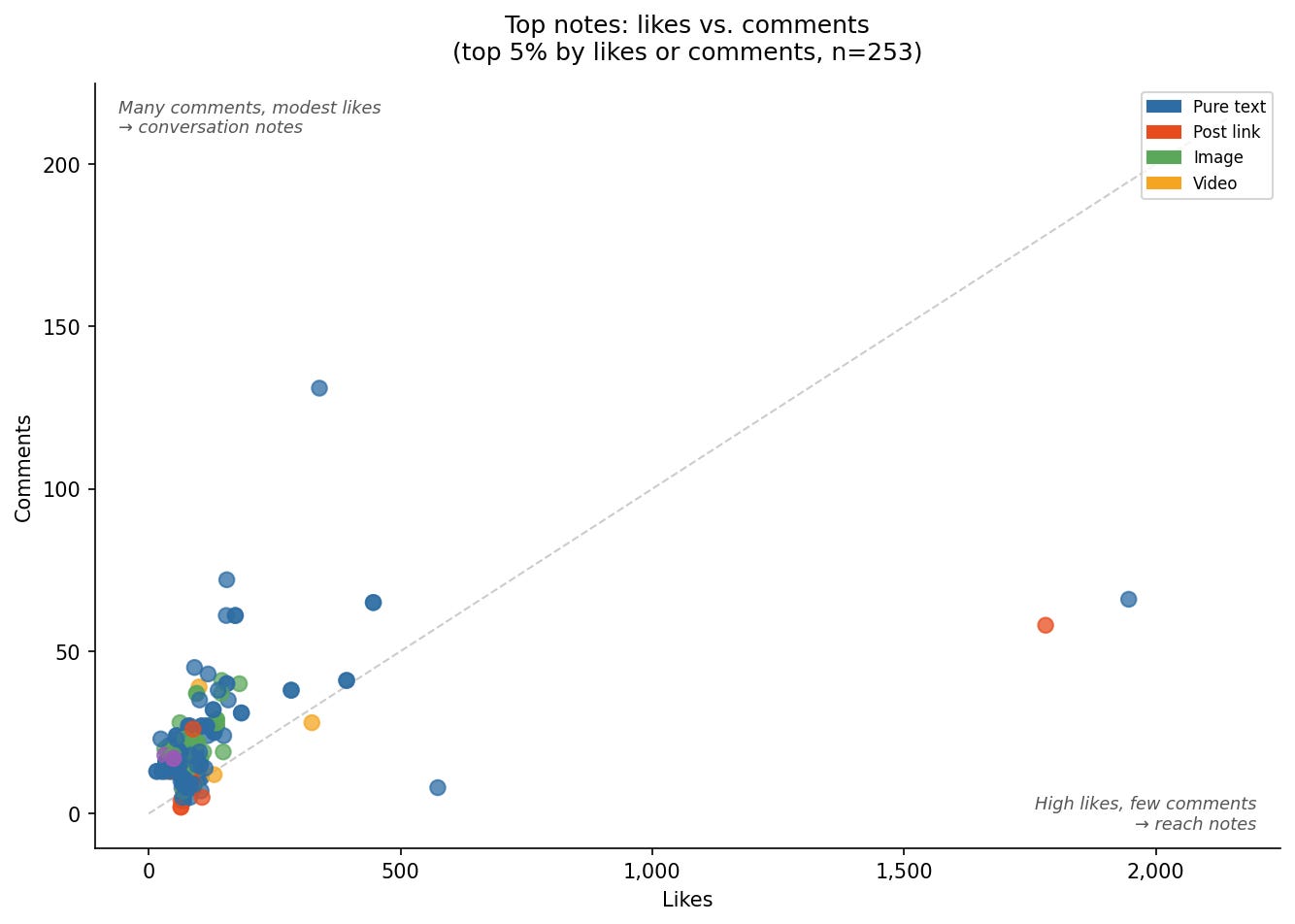 Post-link notes consistently underperform standalone notes. Karen’s feed is 68% post-link, and most of those are promoting others’ work, not her own. Generous, but low engagement by nature. The comments and likes concentrate on her original notes, the ones where she’s actually saying something herself.