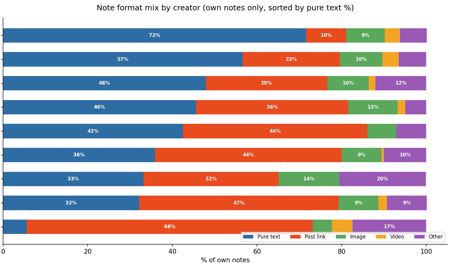 First pass: classify every note by attachment type across all nine creators. Pure text, post link, image, comment/reply. Sort each creator’s notes by likes. Give me the top ten per creator.