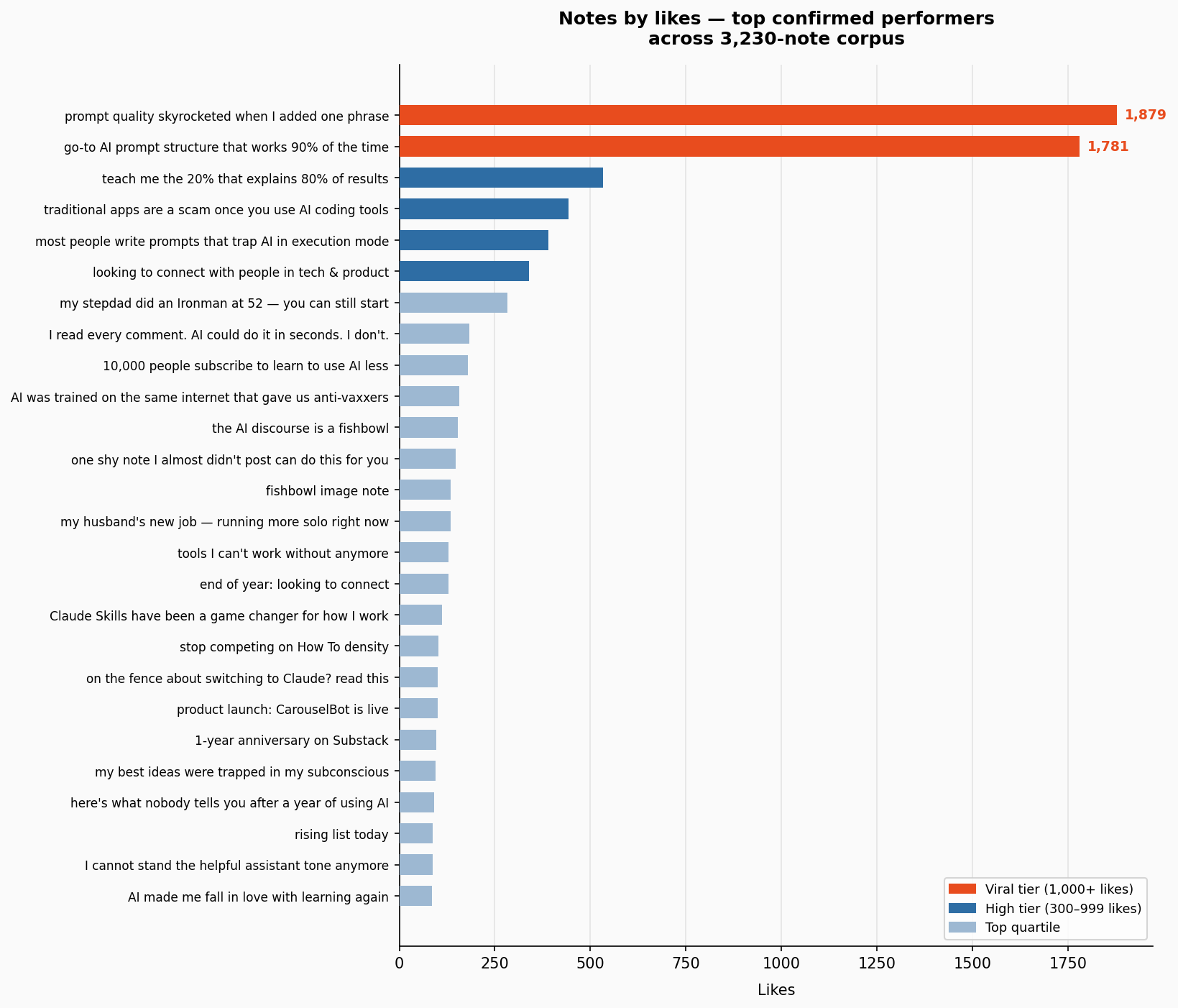 Top confirmed notes by likes across the 3,230-note corpus. Two notes break away from the rest by an order of magnitude.