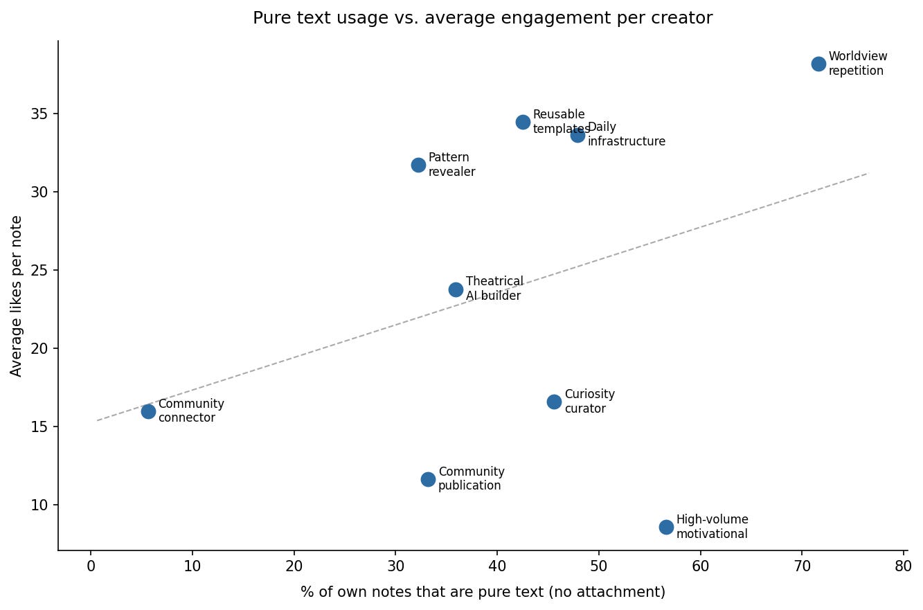 The top two by per-note engagement (one at 37.9 average likes, one at 33.4) both post predominantly pure text, above 70%. When I sorted by attachment type across the full corpus, pure text came out ahead every time.