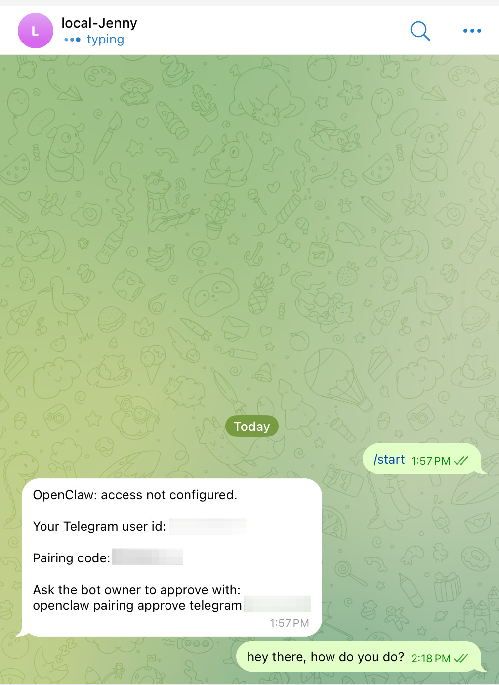 The first time you message your bot after setup, you won’t get a response. You’ll see a code: