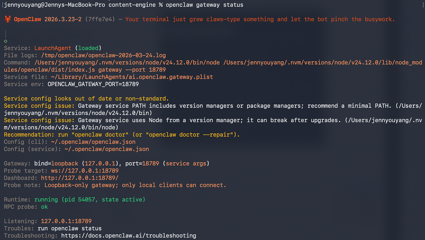 openclaw gateway statusshowsruntime: runningandRPC probe: okIdentity configured — SOUL.md, AGENTS.md, and USER.md are filled in with real constraints, not default placeholders