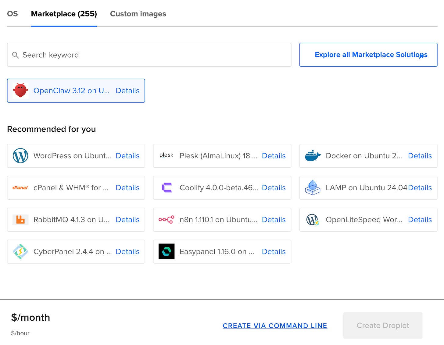 → DigitalOcean: OpenClaw exists in their marketplace as a 1-click app, but the Droplet creation UI is currently broken — region selection doesn’t persist and the Create button stays grayed out. Skip it for now.