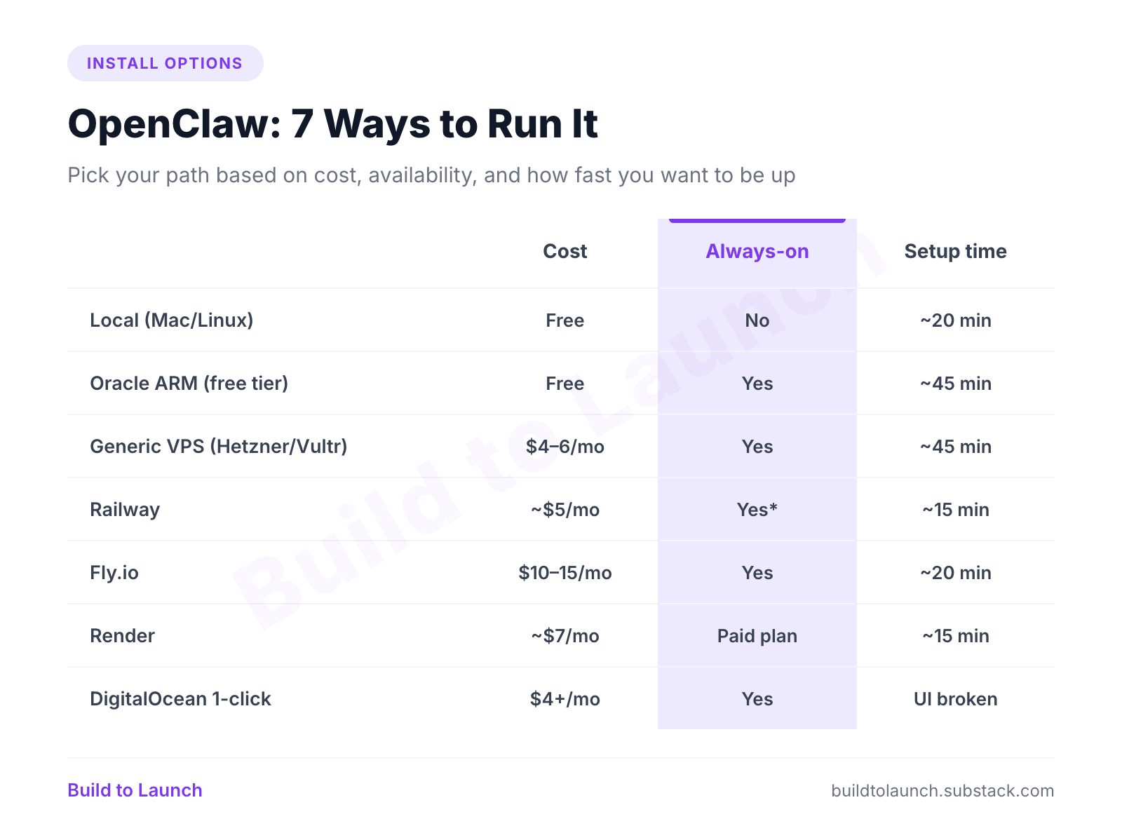 Seven real options. The short version: if you’re on a generic VPS (Hetzner, Vultr, Linode), the setup is identical to Oracle ARM — bare Ubuntu, same manual steps, same systemd config. The only difference is you’re paying for what Oracle gives away free.